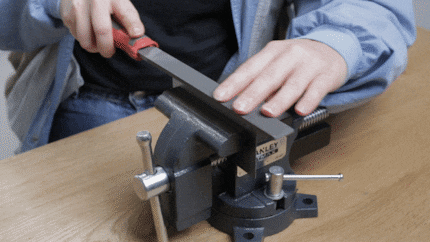 Als Erstes bearbeite ich eine der Längsseiten der Ziehklinge mit der Feile. Du kannst auch die Querseite schleifen, um zum Beispiel Leimreste aus Ecken zu kratzen. Ich spanne die Ziehklinge in den Schraubstock und fahre mit der Feile im rechten Winkel darüber, bis eine scharfe Kante entsteht.