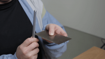 Dasselbe wiederhole ich nun mit der 3000er-Körnung. Zusätzlich schleife ich auch die Seiten. Dafür lege ich die Ziehklinge flach auf den Stein und drücke die Kante mit einem Finger etwas herunter.