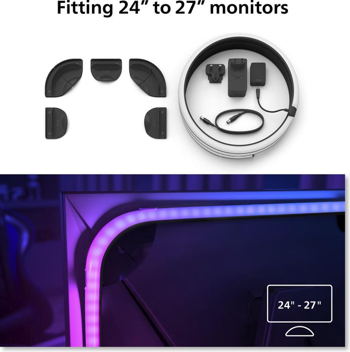 Hole dir einen Farbverlauf aus reaktivem, farbigem Licht für dein Gaming-Setup! Befestige den Hue Play Gradient Lightstrip mit den mitgelieferten Halterungen an der Rückseite deines 24"-27" Monitors. Starte die Synchronisierung mit der Hue Sync Desktop-App, um zu sehen, wie sich das Geschehen auf dem Monitor im Licht spiegelt.