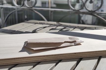 My plywood panel is a good size, so I don't need to cut it to size. So I start with the sanding. I first do a coarse sanding with a grain size of 60 and then another fine sanding with 180 grit sandpaper. For soft wood such as spruce, you should use sandpaper with an open grit pattern, as the sanding grains are further apart and the removed material can be removed more easily. A dense grit is recommended for hard wood such as oak, as this is more robust and durable.