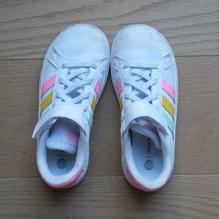 There’s a trick to remember which shoe goes where. If you put the shoes side by side, they should be «kissing» each other. However, because this «kiss» is very subtle, this hack hasn’t been a great help for us so far.