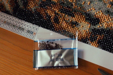 I peel the protective film off the still heavily rippled canvas and finally understand how the diamonds stick to the design. It has an adhesive layer which the diamonds are stuck on to. At the top left side of the design there’s a table with cryptic symbols and numbers. This guides me to the correct bag of diamonds for the respective symbol. Now I just have to decide on the first symbol.