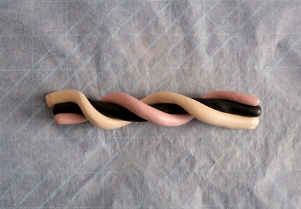 The leftovers can be used to create a marbled effect. Two colours are all you need, by the way. To do this, form two strands, one of each colour, and stick them together! Hold both ends firmly and twist them until you have a mixture of colours along the whole length!