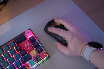 Despite its low weight, the Roccat is equipped with customisable RGB lighting. What’s more, it comes with a 2.4 GHz dongle in addition to Bluetooth. With my needs, I don’t notice any lagging – neither with the dongle, which is faster on paper, nor with Bluetooth.