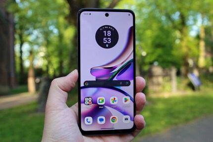 The case of the Moto G13 is made of PMMA, better known as acrylic glass. This is different to the usual plastic cases in this price range. It feels tactile even without hatching, and its colour shimmers without being highly reflective. However, fingerprints are clearly visible.