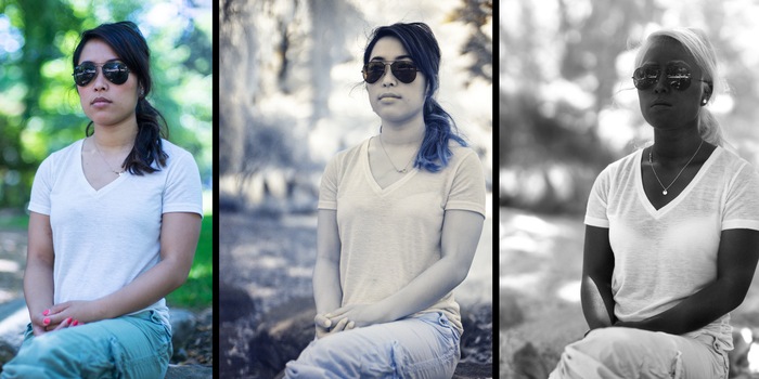 In this comparison, the photo on the far left was taken with a normal camera, the one in the centre with a "normal infrared camera", i.e. a normal camera without an IR cut filter. The photo on the far right shows longer infrared waves that can only be captured with a special SWIR camera. Typical for SWIR photos is that all people have black skin. SWIR cameras have a sensor made of indium gallium arsenide. They also only have a very low resolution. For such a portrait, a large number of photos have to be taken and stitched together like a panorama.