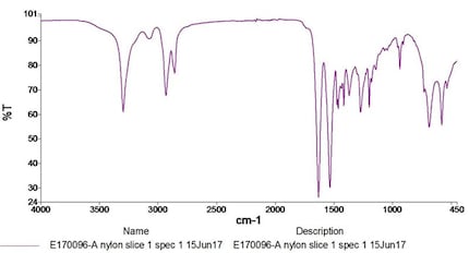 Polyamide 6.6, better known as nylon, has the property of being transparent to certain infrared waves. This diagram shows at which wavelengths this is the case.