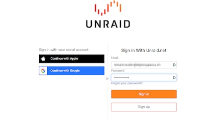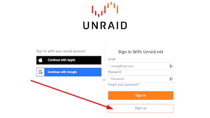 I’m a bit confused at first. I thought I’d have to enter my contact details next. Instead, I’m asked to register with Unraid.net. But since I don’t have an account yet, I choose Sign up.