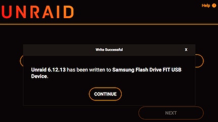 The bootable USB stick, which now contains the Unraid operating system, is ready. From start to finish, this takes a few minutes. As soon as the process is done, a message will appear indicating whether it worked or not.