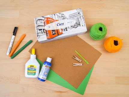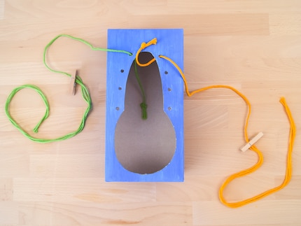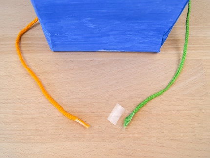 Tie three pieces of yarn together and pull the new rope through the first opening of the box. Of course, you can also use a thick yarn or even a real shoelace for this. But since we're in a DIY mood, the threads are tied into a plait. You can use the clothes pegs to secure the braid if you want to measure the length of the braid or if you need a break.
