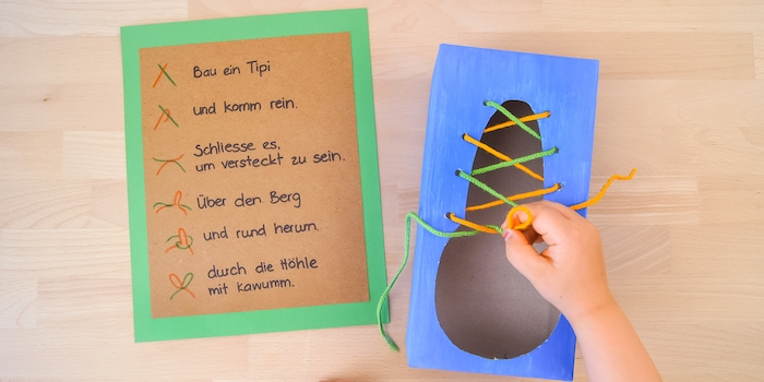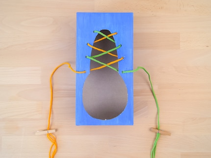 Create a motivation. Either you use the child's inner motivation because they have come up with the idea themselves and want to do something on their own. Or you can offer your child an exciting play experience to practise. For example, after tying their shoes each time, the child can run around the house with their cardboard shoes and play at having the biggest feet in the world.