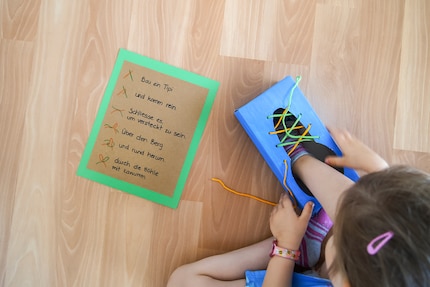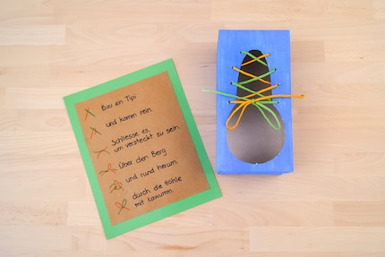 Show allI had almost given up hope with my children. With all the Velcro fasteners, they were never motivated to tie their shoes. Last week, however, my son came to me: "I can't tie my swimming trunks during swimming lessons." It's now or never, I thought to myself. It's time to teach my children the shoe-tying technique. He and his sister now practise the "Mäschli" diligently every day. Especially because they get to walk around with the funny cardboard shoe.