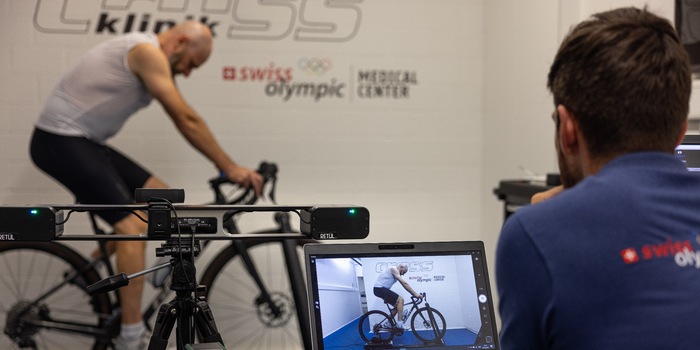 Half an hour has gone by and my gravel bike still hasn’t been touched. But that’s about to change now. Crossklinik is equipped with Retül’s 3D motion capture system, which provides advanced analysis to determine dynamic seating position. It allows Raphael Böni to measure the body angles of athletes within only a few seconds. As a result, any changes that are made to the seating position can be seen immediately, making it easier to find the perfect position.