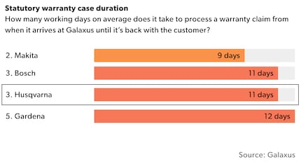 Under «statuatory warranty case duration», customers can see how long it takes on average for a type of product from a given brand to be returned to the owner in the event of a warranty claim. Like the other rankings, this is based on data from the last 24 months. In the case of Husqvarna lawn mowers, for example, it usually takes eleven days for a replacement to be delivered or for the repaired machine to be returned. In contrast, competing products from Einhell take an average of five days.