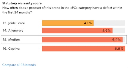 «Statuary warranty score» shows how often a type of product from a given brand was defective within the first 24 months after purchase. Just under 6.4 per cent of Medion PCs, for example, end up in warranty claims within two years, while the rate for Apple computers is 0.8 per cent. «The warranty score is a good indicator of product quality,» Zara says. «Now, for the first time, consumers have access to reliable statistics on defects to complement their own gut feeling as well as reviews by experts and other customers.»