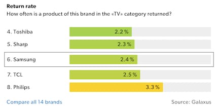 The «Return rate» shows how often a type of product from a given brand was returned in the last 12 months. For example: in the last 12 months, customers returned 2.4 per cent of all Samsung TVs purchased at Galaxus.