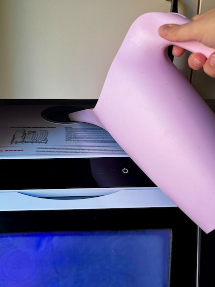 At 46 × 42 × 43 centimetres, my lifesaver’s as large as a medium-sized Galaxus parcel and sits on the kitchen counter. It fits perfectly in an unused niche and isn’t in the way at all. The mini dishwasher doesn’t need a water connection or drain. It’s equipped with a five-litre tank that I fill with cold water before each wash cycle. The dirty water flows through a hose into the sink. Once the machine’s finished, I simply stick the hose to the wall tiles with a suction cup. My countertop dishwasher offers six programmes – from a quick cycle for glass to intensive cycle for burnt-in food. After the wash cycle, Dishy dries the dishes. It’s simple and does exactly what I need it to.