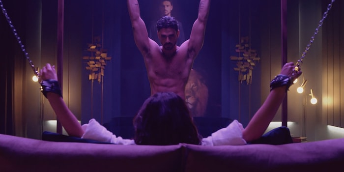 The teaser image for the film shows Laura tied to the bed with her arms while Massimo stands dominantly in front of her. In the background is a huge oil painting of him with a lion, which makes the already over-staged setting even more absurd. The image gives the viewer the impression that things are going to get rough in the film. However, apart from this one scene, there is not much to see of BDSM in the film.