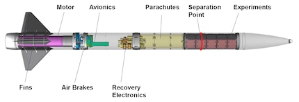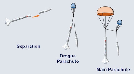 Once the rocket has reached the target altitude, it is split into two parts at the separation point to release the parachutes.