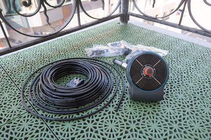 The small set consists of an irrigation controller, batteries, a 20 metre long distribution pipe, eight T-pieces, 20 drippers, a filter, sealing caps and 15 holders that resemble spanners. There is also an instruction manual. Whereby operating instructions is a big word for two A5 pages of half-comprehensible pictures, supplemented by a few words on safety, disposal and warranty. If you're not much good with paper anyway, you can use the QR code to watch a video on commissioning.
