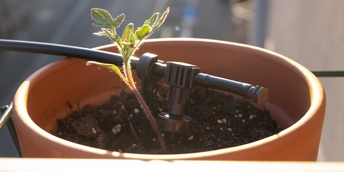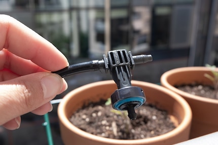 Then I can lay the distribution pipe. The first stage leads from the control unit to the first plant. I measure the distance between the two and cut the tube straight through at the right point. One end goes to the "OUT" connection of the control unit, the other to a dripper. From this dripper it goes to the next one in the neighbouring pot. If you have two rows of plants or they are spread out all over the place, you can build several paths using the T-pieces. In my case, this is not necessary as all the tomatoes grow close together.