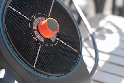 The first thing I do is insert the rechargeable batteries into the control unit. Even then, I'm almost reaching my limits. I can't get the cover off the compartment without a screwdriver. With the screwdriver, I almost break off the tab, but everything turns out fine. However, I probably couldn't repeat the exercise. As soon as the batteries are in, I place the control unit with the rotary knob on "OFF" in a sunny spot for the next eight hours: it's time to recharge my batteries.