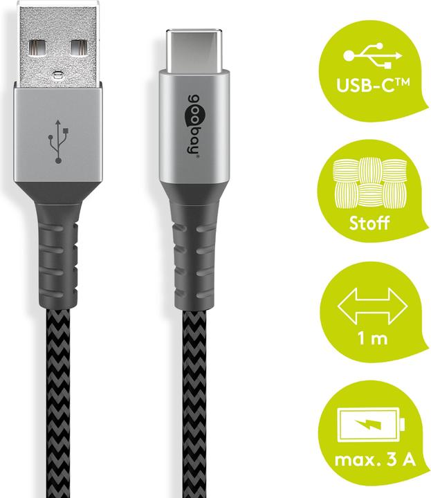 Our USB connection cables support mobile phones, cameras, headphones, smartwatches, tablets, and much more for power supply and data transfer. The Goobay USB cable enables a seamless connection and achieves high-speed transfer rates. USB-C is compatible with the following models of Apple iPhone and Apple iPad: iPhone 15, iPhone 15 Plus, iPhone 15 Pro, iPhone 15 Pro Max, iPad Pro 12.9" Gen. 3, 4, 5, 6, iPad Pro 11" Gen. 1, 2, 3, 4, iPad Air Gen. 4, 5, iPad Gen. 10, iPad mini Gen. 6. The Goobay USB-C charging cable allows for fast charging with a maximum of 3 A. The USB-C data cable has a high-speed data transfer rate of up to 480 Mbit/s. The braided textile cable with optimized bend protection at the metal connectors is protected against cable breaks and is designed for over 10,000 bending cycles. With reinforced metal connectors and a textile sheath, the USB-C to USB-A charging cable is extremely durable and long-lasting. This mobile charging cable can charge any device equipped with a USB-C port. The robust 2 m long USB-C cable is extra long for bridging larger distances, such as at the workplace or in a home office. The braided textile sheath of the USB-C charging cable offers a pleasant feel and is gentle on sensitive surfaces.