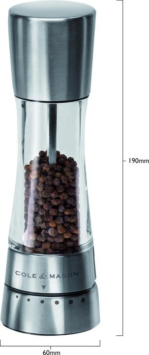 As one of the most well-known and popular gourmet precision mills, the Derwent pepper mill brings professional seasoning and control to everyday cooking with its sleek stainless steel and acrylic profile. Simply turn the stainless steel collar of the Derwent pepper mill to one of the 6 preset settings to achieve a fine to coarse grind during and after cooking; use a coarse grind for steaks, a medium grind for pizzas, and a fine grind for soups and sauces. Each pepper mill features a pressure closure for easy refilling. The award-winning gourmet precision mechanism from Cole & Mason crushes the peppercorns instead of grinding them, slicing them to release maximum flavor evenly with each turn. These mills are equipped with a hardened carbon steel mechanism for pepper and a diamond-sharp ceramic mechanism for salt, and they come with a lifetime guarantee.