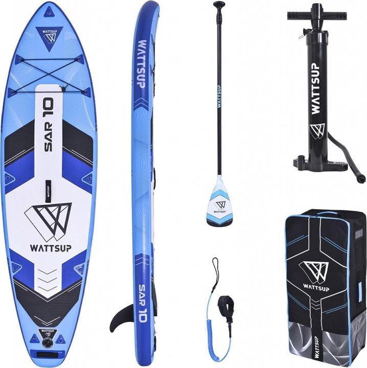 The Wattsup brand marks the end of entry-level boards with a thickness of 10 cm by offering accessible and high-quality stand-up paddle boards to riders. At the same time, the SUP Wattsup is more stable, stiffer, and more durable. It is also equipped with 4 D-rings to attach a kayak seat and a kickpad, enhancing maneuverability. Comparable to Aquamarina's Thrive model, we present the inflatable SAR 10' board from Wattsup. This hybrid and very stiff model with rounded hulls and race shape is 305 cm long and 81 cm wide, featuring generous volume. It is very stable and suitable for beginners who want to learn. Compatible for riders up to 125 kg, this board is perfect for larger riders. Its unique dimensions give it rare versatility: Touring: 305 x 81 cm for more influence on the water and increased speed; Ride: 15 cm thick for optimal stability; Surfing: Kickpad option for easy maneuvering of your board in the waves; Kayak: 4 D-rings added to transform it into a kayak.
