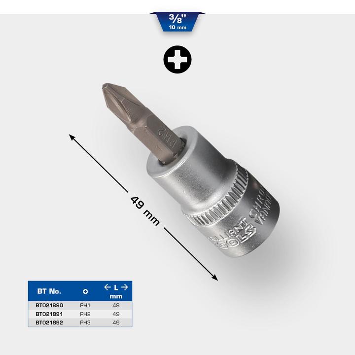 Manufactured according to DIN 3120. 3/8" internal square drive (10 mm). Made from high-quality chrome vanadium steel for exceptional durability. Matt chrome finish. PH1 cross-slot profile.